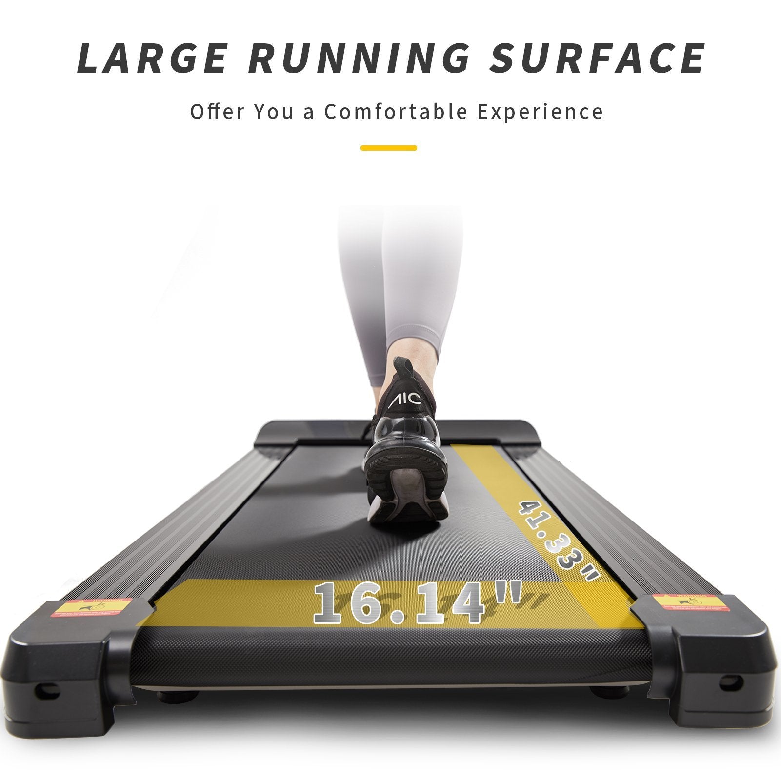 [Enlarged Running Platform & Shock Absorption Design] The walking treamill offers shock absorption design, allowing you to walk or excercise without damaging your knee or ankle. The 41"×16" walking area gives you a more comfortable experience.